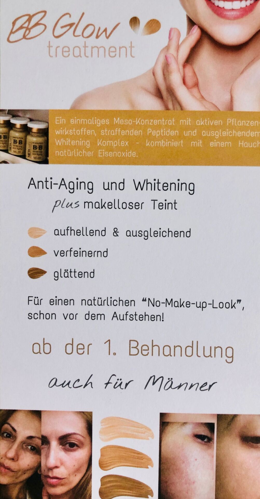 Meso-Behandlung und Semipermanent Make-up. Diese Behandlung kombiniert effektive Meso-Wirkstoffe mit natürlichen Pigmenten. Wir wollen die Haut nicht einfach überdecken, sondern das Beste aus ihr herausholen. Deshalb steht unser BB Treatment für nachhaltige Hautverbesserung mit einem dauerhaft gleichmäßigen Teint. Wir verwenden Hautseren mit dem maximalen Einsatz von Powerwirkstoffen. Diese einzigartigen Produkte bieten Ihnen eine Halbwertszeit von bis zu 6 Monaten (je nach Hauttyp und Lebensgewohnheiten, sowie Gesundheitszustand und Medikamenteneinnahme). Durch die leichten Pigmentanteile findet eine effektive Hautbildverbesserung ab der 1. Behandlung statt, die trotzdem natürlich aussieht und sich von Behandlung zu Behandlung weiter aufbaut. Für ein langanhaltendes Ergebnis empfehlen wir 3-5 Behandlungen in Folge. Die Behandlung ist ganzjährig anwendbar, da sich die Pigmente dem Hautton anpassen und eine gewünschte Bräunung nicht negativ beeinflussen.