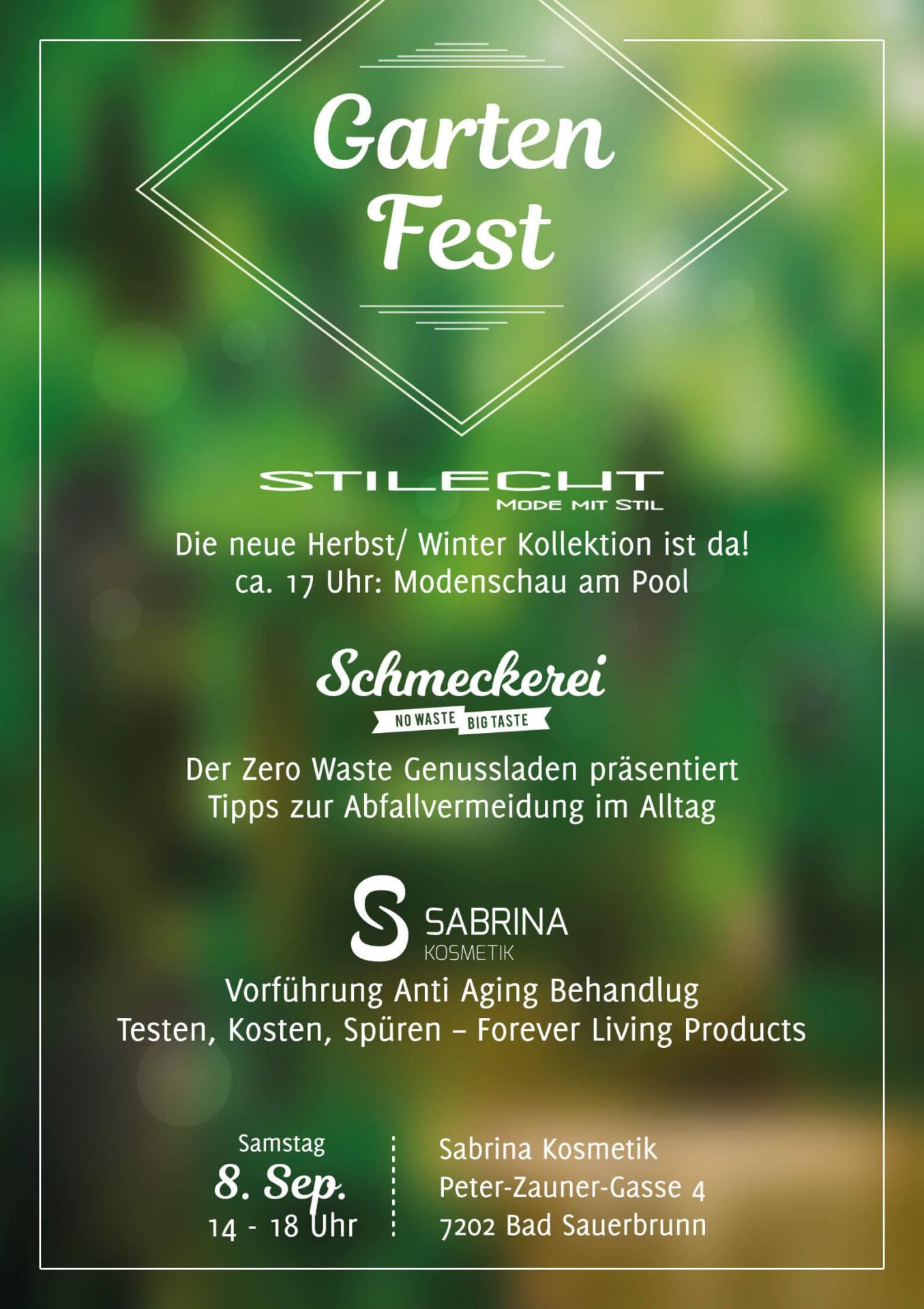 Ich, Sabrina Mayer, “ SABRINA Kosmetik“ freue mich Ihnen Anti Aging Behandlungen „LIVE“ vorzuführen und Ihre Fragen zu beantworten. Weiters gibt es die Produkte von FOREVER LIVING PRODUCTS zu testen, zu kosten und zu spüren. Access Bars ® was ist das und was kann das? Fragen & Antworten. 🙂